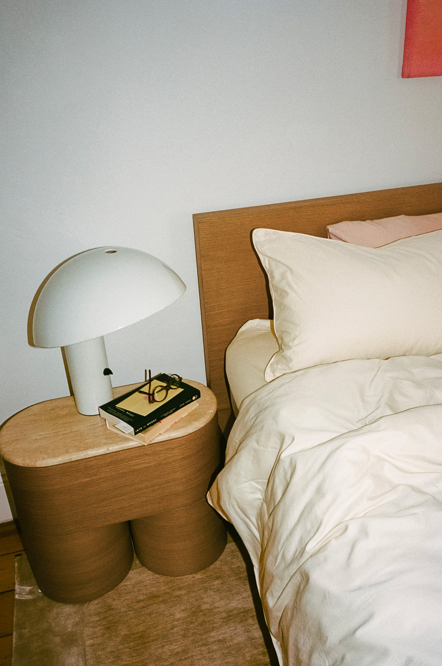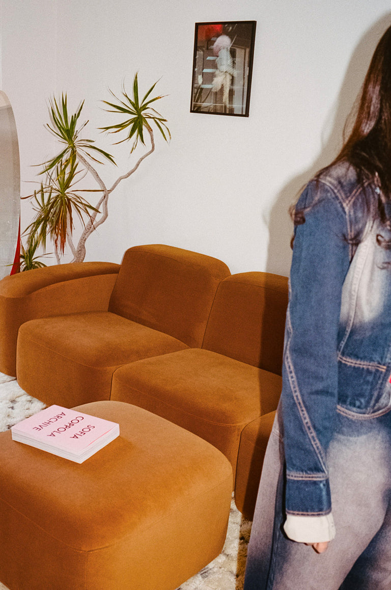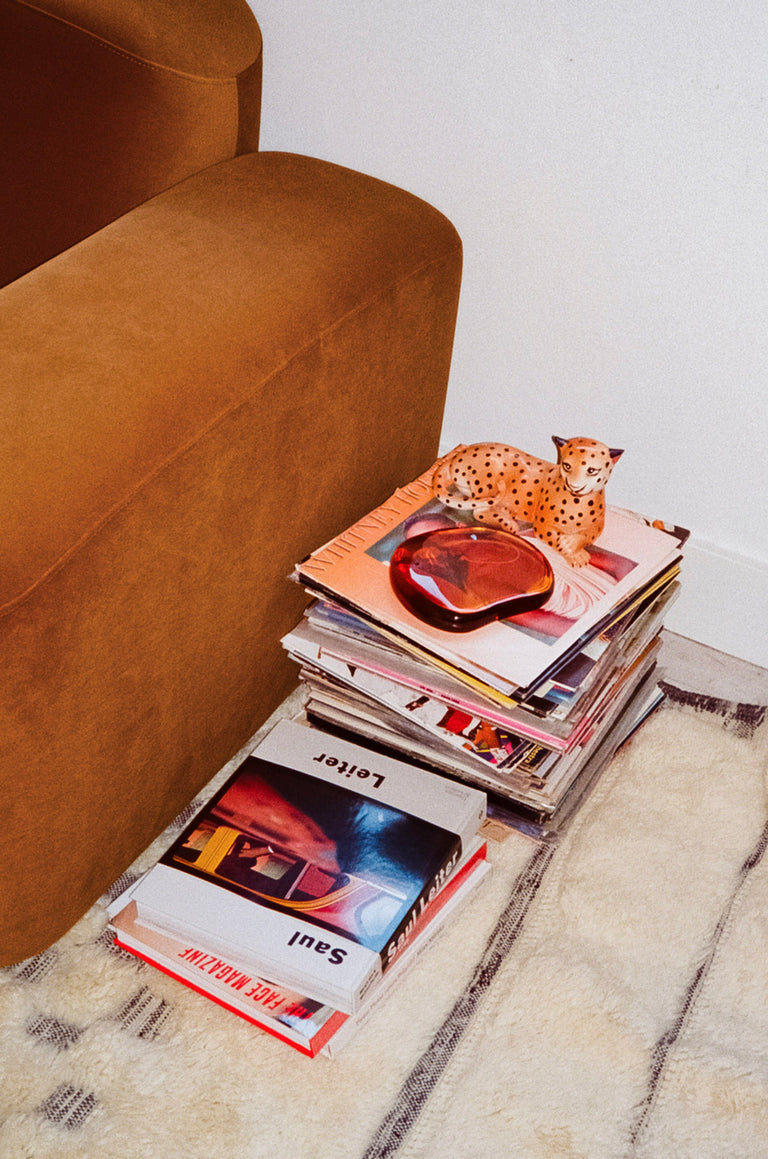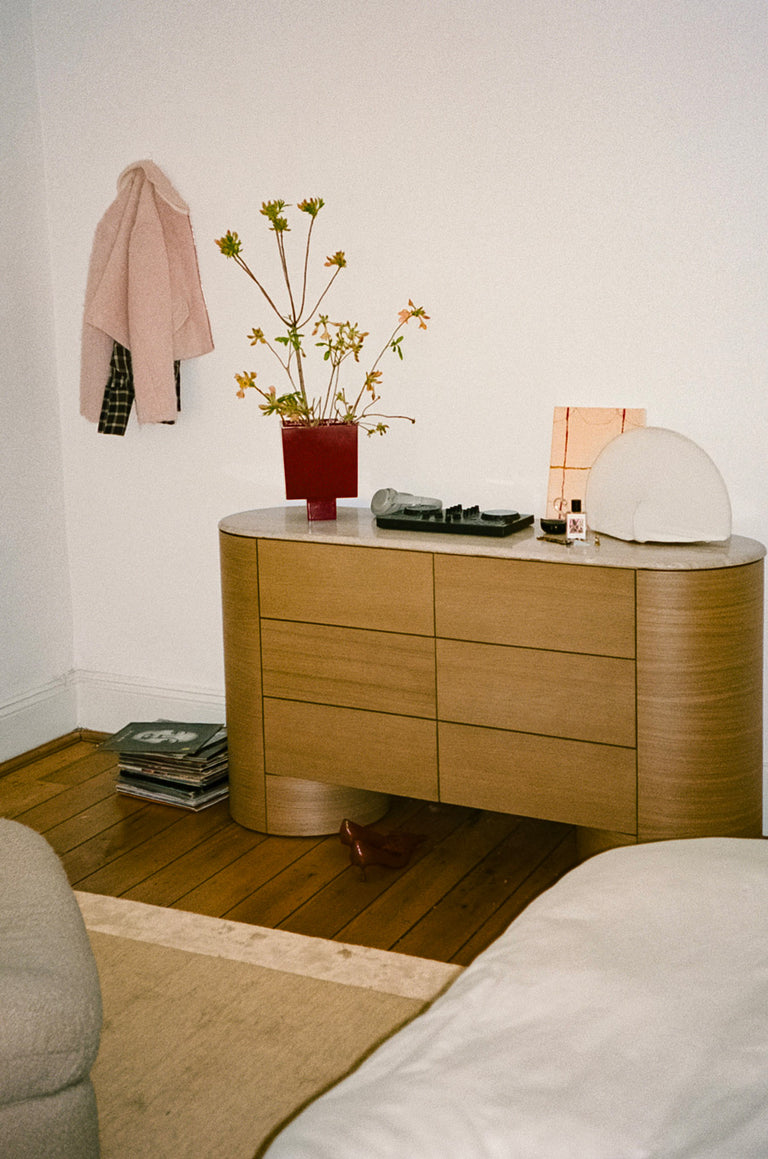 Sculptural forms, soft neutrals and spirited pops of colour sit alongside art from friends and emerging Australian voices. Books, records and small collected pieces reflect the creative world she moves through - thoughtful, expressive and a little irreverent.