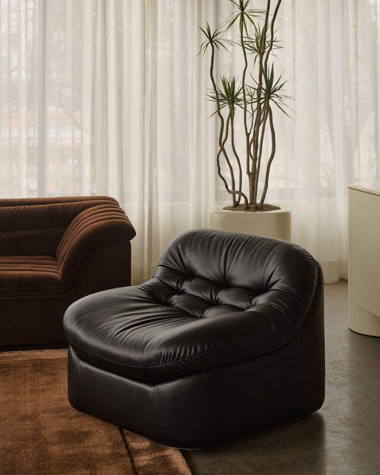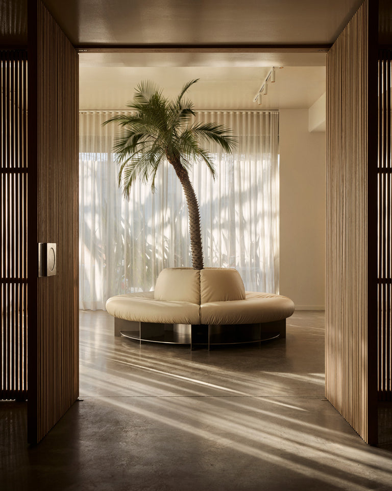 It’s a space that captures our evolving design language: nostalgic, playful, and full of personality, while remaining true to the DNA that has always defined us. The journey begins in our reception, where a palm tree greets you like an old friend. It’s wrapped by a custom leather and steel seating installation we designed in-house, a place to pause before exploring the rest of the studio. Just beyond sits a travertine ping pong table - a reimagining of our “Earth” collection - reminding us (and our guests) that while we take our work seriously, we don’t take ourselves too seriously.