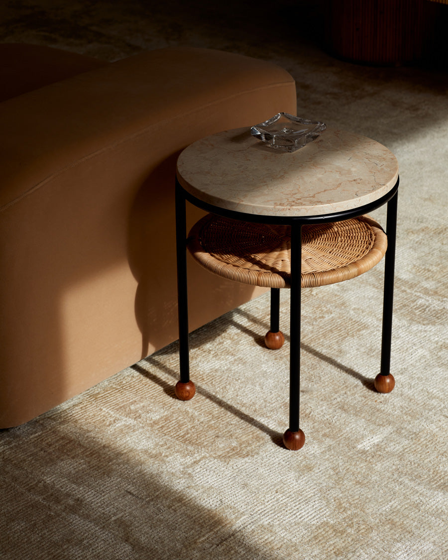 Strong steel legs, detailed touches of rattan and playful spherical walnut feet make it clear that Pierre is here to be seen. Whether the creamy marble or tan leather elements take your fancy, you can rest assured knowing this ageless collection sits as comfortably in a bedroom as it does your living space.