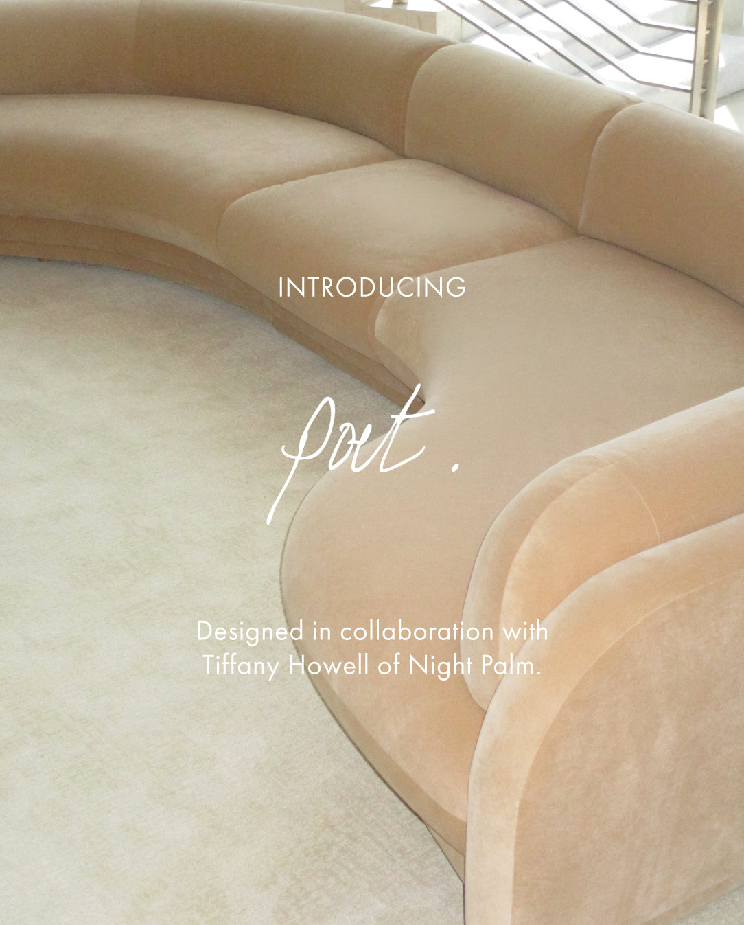 Sculptural and refined, Poet has fluid, sweeping curves that flow beyond an offset, asymmetrical frame - creating a dynamic interplay of form and balance. Its undulating silhouette draws on Howell’s vintage inspirations, reimagined through ELLISON STUDIOS’ contemporary lens for living. Poet carries a quiet romance in its storytelling. It becomes the backdrop for a first kiss, a place to daydream or a stage for impromptu dance parties with friends, or the seat for family movie nights. As figurative as it is emotional, every impression left on its fabric becomes a poem.
